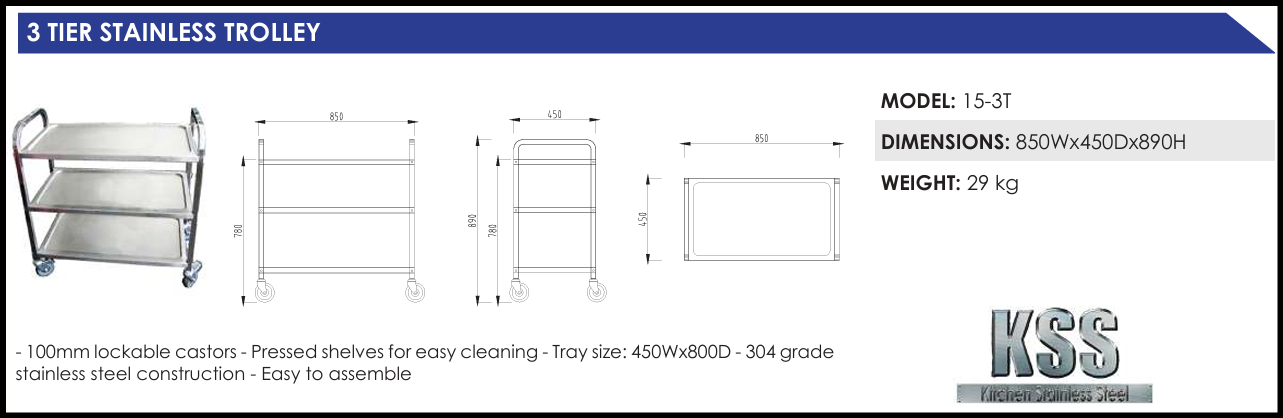 Kitchen Stainless Steel Trolleys are purpose built for bakeries, restaurants, hotels and other commercial food establishments. Trolleys are equipped with high quality, non-marking and quiet running castors that are lockable. Square tubed stainless steel construction gives added strength making KSS trolleys suited for heavy duty use in the busiest of operating environments. The 15-3T features three tiers that allow you to carry food. The pressed shelves make for easy cleaning. Perfect for a hotel room service food cart or other applications. All KSS products have stainless steel tops, stainless steel shelves and stainless steel legs.