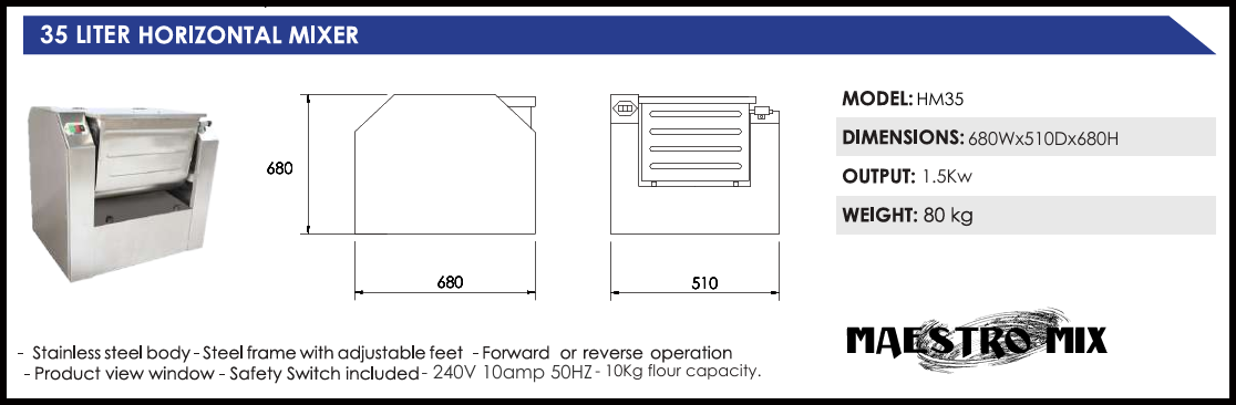Product view view window, Safety Switch included, 240V 10amp 50HZ, 10kg flour capacity.