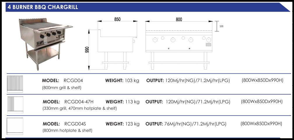 bar spaced at 85mm to suit GN 1/9 pans – Available in Natural Gas and LPG