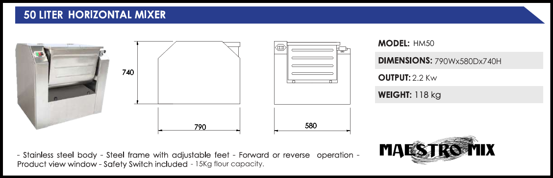 Product view window, safety Switch included, 15kg flour capacity.