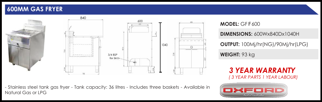 The Oxford GFF600 is a stylish high efficiency single tank freestanding gas deep fryer. Suitable for your fish & chicken frying needs. The GFF600 has a 36 litre stainless V shape steel gas tank, includes 3 baskets. available in Natural gas &LPG. *Optional extra Fish Plate POA