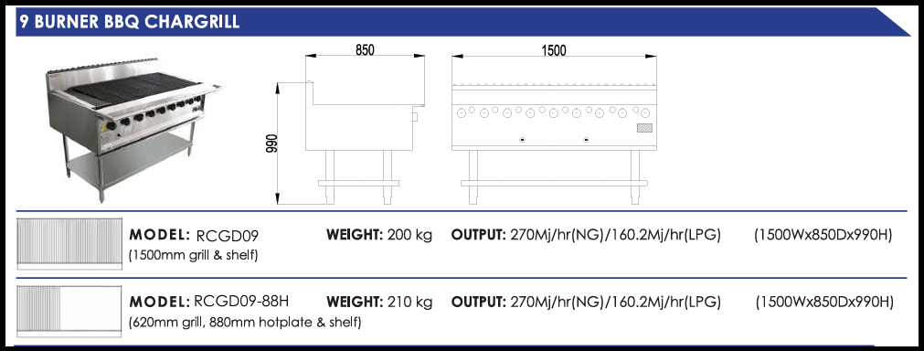 bar spaced at 85mm to suit GN 1/9 pans – Available in Natural Gas and LPG