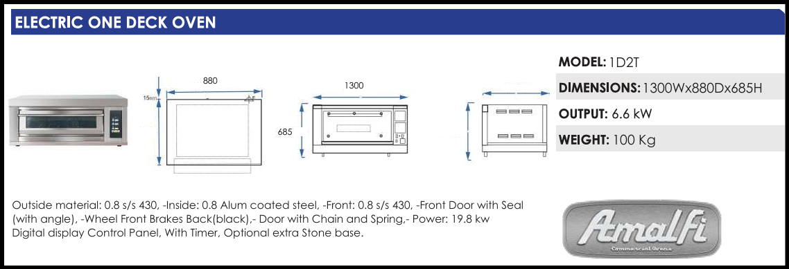 - All Amalfi range of ovens are built using the highest quality stainless steel to ensure a durable and long lasting product.