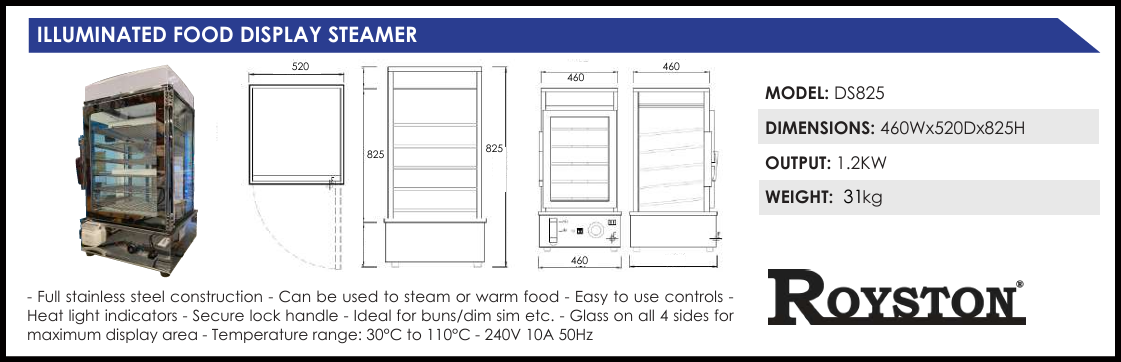 Heat light indicators – Secure lock handle – Ideal for buns/dim sim etc. – Glass on all 4 sides for