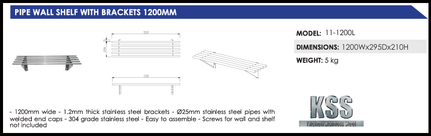 .1200mm wide – 1.2mm thick stainless steel brackets – ?25mm stainless steel pipes with welded end caps – 304 grade stainless steel – Easy to assemble – Screws for wall and shelf not included