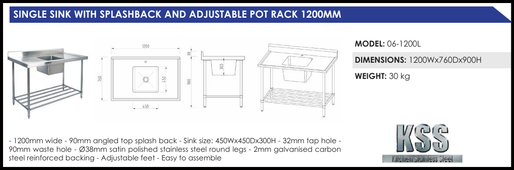 Kitchen Stainless Steel Single Sink Benches feature a 90mm angled splashback with a bevelled edge and a centrally located sink. Made to the highest specifications using 304 grade stainless steel and 2mm galvanised carbon steel reinforcement. KSS sinks are ideal for heavy duty use. All stainless steel sinks are 450x450x300 deep with 90mm waste hole and come with a satin polished stainless steel pot rack underneath as standard. Benches are also fitted with a 32mm tap hole. All KSS products have stainless steel tops, stainless steel shelves and stainless steel legs. Available in a variety of size from 600mm to 1800mm, you can be sure to find a size that is suitable for your kitchen