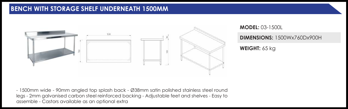 KSS 1500mm Bench w/ Shelf Underneath and Splashback
