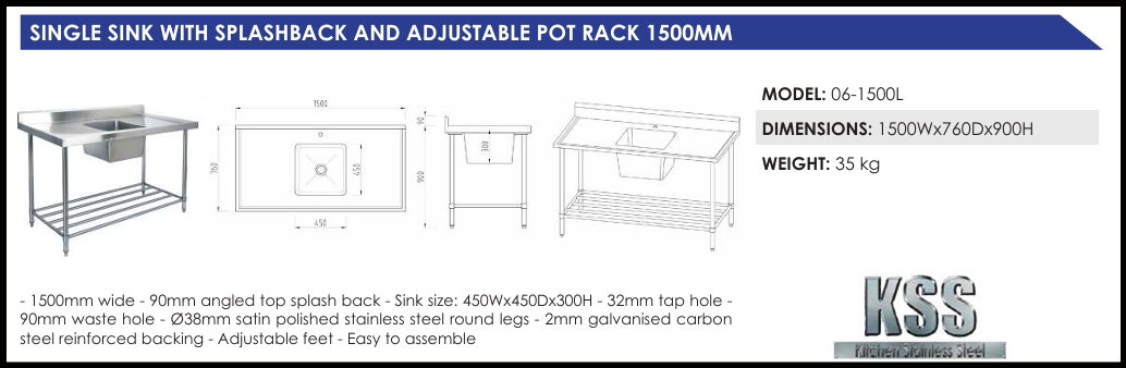 KSS 1500mm Single Sink w/ splashback and Adjustable Pot Rack