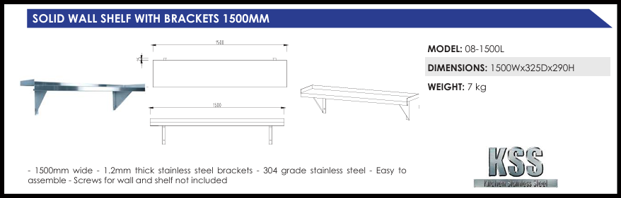 Kitchen Stainless Steel wall shelves are an ideal solution for commercial kitchens and food premises. Extremely sturdy and durable, KSS shelves are manufactured using 304 grade stainless steel to ensure the highest quality and durability. The shelves feature a 1.2mm thick stainless steel top. All shelving products by KSS come flat packed for easy transport and are quick and simple to assemble. All KSS products have stainless steel tops, stainless steel shelves and stainless steel brackets.