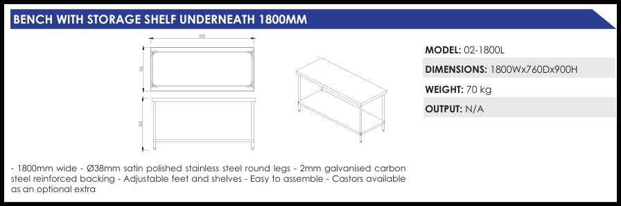 1800 mm wide ?38 mm satin-polished stainless steel round legs 2 mm galvanised carbon steel reinforced backing Adjustable feet and shelves.