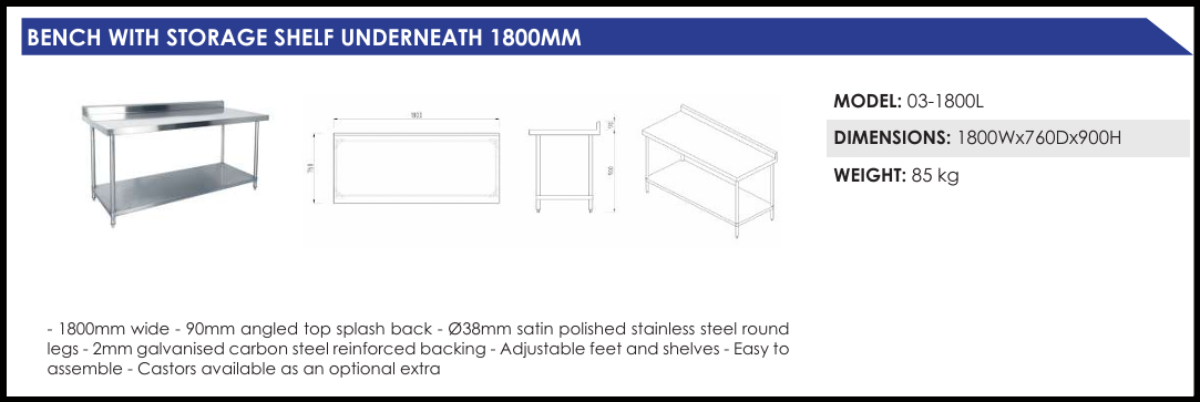 Choose from a huge range of full stainless steel benching. All stainless steel benches come standard with an undershelf for storage. 304 grade full stainless steel top with 2mm galvanised carbon steel reinforcement and 38mm satin polished round stainless steel legs give Kitchen Stainless Steel benches the durability and rigidity under high stress. Available in a variety of sizes from 900mm to 2400mm. These benches feature splashbacks and ideally make for benches that can be rested against walls
