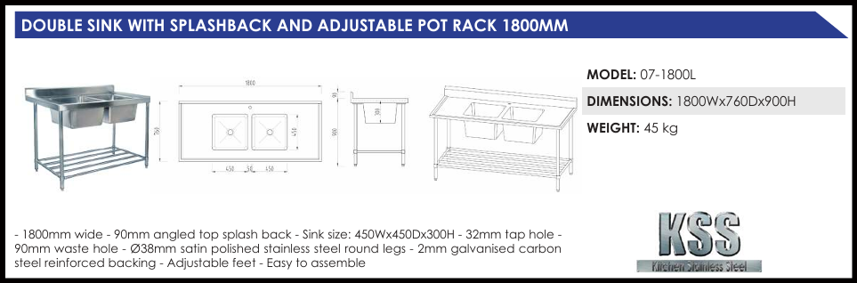 Kitchen Stainless Steel Double Sink Benches feature a 90mm angled splashback with a bevelled edge and a centrally located sink. Made to the highest specifications using 304 grade stainless steel and 2mm galvanised carbon steel reinforcement. KSS sinks are ideal for heavy duty use. All stainless steel sinks are 450x450x300 deep with 90mm waste hole and come with a satin polished stainless steel pot rack underneath as standard. Benches are also fitted with a 32mm tap hole. All KSS products have stainless steel tops, stainless steel shelves and stainless steel legs. Available in a variety of size from 1200mm to 2400mm, you can be sure to find a size that is suitable for your kitchen.