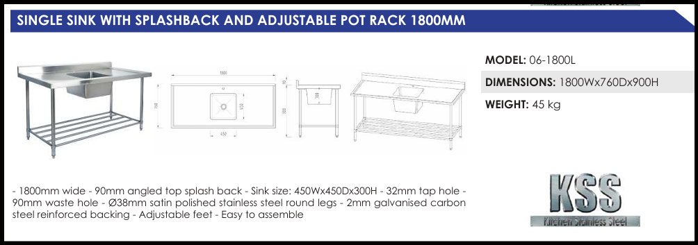 Kitchen Stainless Steel Single Sink Benches feature a 90mm angled splashback with a bevelled edge and a centrally located sink. Made to the highest specifications using 304 grade stainless steel and 2mm galvanised carbon steel reinforcement. KSS sinks are ideal for heavy duty use. All stainless steel sinks are 450x450x300 deep with 90mm waste hole and come with a satin polished stainless steel pot rack underneath as standard. Benches are also fitted with a 32mm tap hole. All KSS products have stainless steel tops, stainless steel shelves and stainless steel legs. Available in a variety of size from 600mm to 1800mm, you can be sure to find a size that is suitable for your kitchen