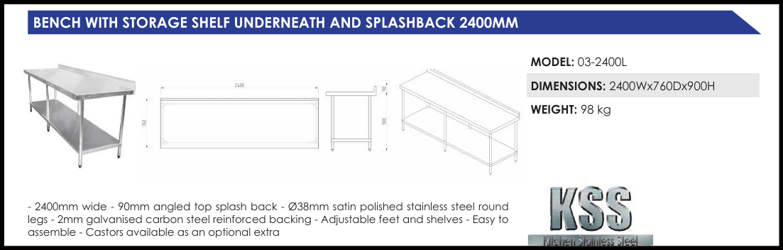 KSS 2400mm Bench w/ Shelf Underneath and Splashback