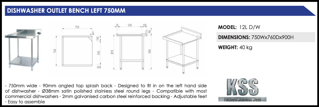 Kitchen Stainless Steel Outlet Benches feature a 90mm angled splashback with a bevelled edge. Made to the highest specifications using 304 grade stainless steel and 2mm galvanised carbon steel reinforcement. This outlet bench is compatible with most commercial dishwashers. Featuring adjustable feet, this outlet bench is design to fit on the left hand side of the dishwasher.