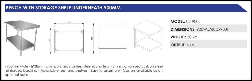 900mm wide stainless steel shelving unit with ?38mm polished round legs, 2mm galvanised steel reinforced backing, adjustable feet and shelves. Easy to assemble; optional castors available.