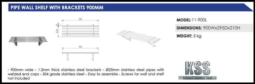 .900mm wide – 1.2mm thick stainless steel brackets – Ø25mm stainless steel pipes with welded end caps – 304 grade stainless steel – Easy to assemble – Screws for wall and shelf not included