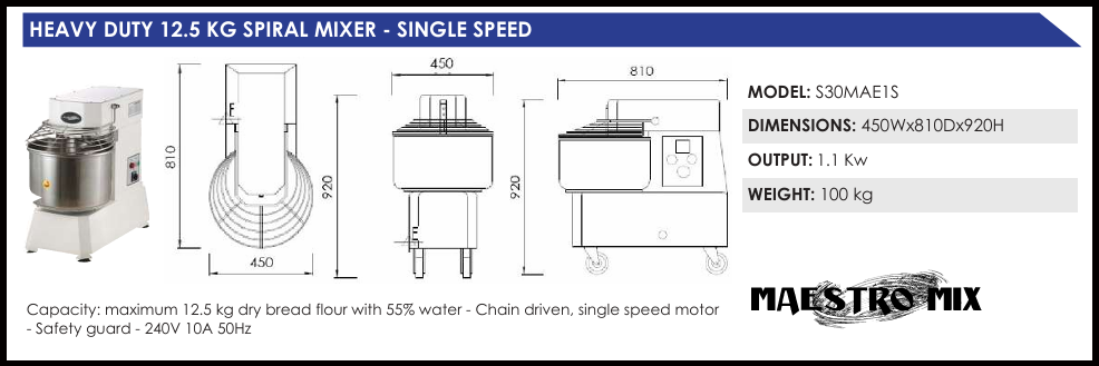 Select from a range of specialist dough mixing spiral mixers. In a spiral mixer, a spiral-shaped agitator remains stationary while the bowl rotates. This method enables spiral mixers to mix the same size dough batch much quicker and with less under-mixed dough than a similarly powered planetary mixer. Spiral mixers can mix dough with less agitator friction than planetary mixers. This allows the dough to be mixed without increasing its temperature, ensuring the dough can rise properly. The S20MAE1S can mix up to 12.5 kg dough mixed with 55% water. The single speed gear design makes this unit a powerful and heavy duty asset in your kitchen that is guaranteed to bring down dough preparation times. The Maestro Mix range of spiral mixers are the ideal choice for pizzerias, dumpling restaurants, indian and middle eastern restaurants, bakeries and cafes that bake their own bread.3 years warranty
