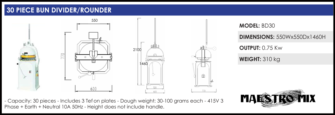The Maestro Mix BD30 Bun Divider/Rounder forms an essential part of any bakery. Saving you time and labour costs, the BD30 can divide and round consistent and even dough. With precise and easy to operate controls, dough can be divided into 30 pieces between 30-100 grams each. The stainless steel dividing knives and 3 Teflon plates (included) ensure durability and a long lasting product. This product is fully compliant to Australian standards.