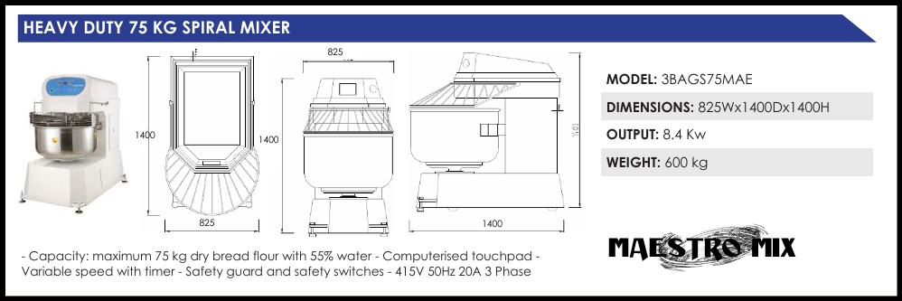 Select from a range of specialist dough mixing spiral mixers. In a spiral mixer, a spiral-shaped agitator remains stationary while the bowl rotates. This method enables spiral mixers to mix the same size dough batch much quicker and with less under-mixed dough than a similarly powered planetary mixer. The Maestro Mix range of spiral mixers are the ideal choice for pizzerias, dumpling restaurants, indian and middle eastern restaurants, bakeries and cafes that bake their own bread. 3 years warranty