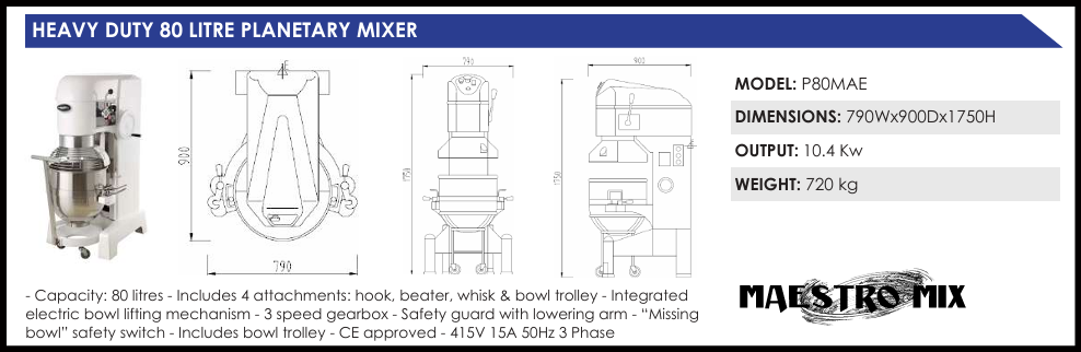 Planetary mixers consist of a bowl and an agitator. The bowl remains static, whilst the agitator is rapidly moved around the bowl to mix its contents. With the ability to mix a wide variety of ingredients, planetary mixers are more versatile than their spiral counterparts. Planetary mixers can be used to whip and blend, whereas spiral mixers cannot. Create a range of meringues, whip egg whites, mix batter for cakes, prepare icing or mix puddings with the Maestro Mix range of planetary mixers.3 years warranty