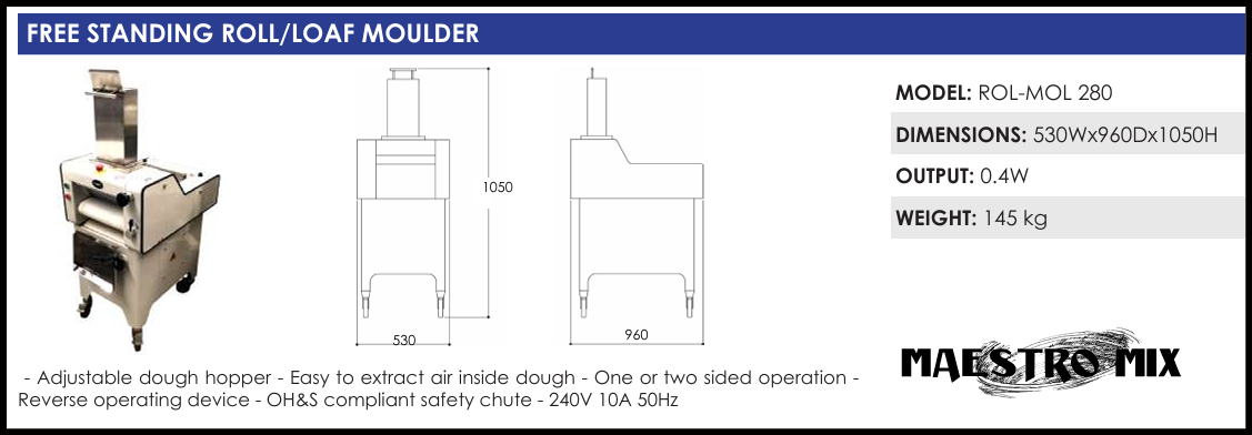 The Maestro Mix ROL-MOL280 Freestanding Roll/Loaf Moulder brings unprecedented flexibility and versatility to any bakery. Less manual handling of the dough means you can save on labour costs. Ideal for small rolls to large French baguettes, the roll moulder features an adjustable dough hopper and a reverse operating device. The unit can be operated from one or two sides depending on your preference. Easy to use controls allow precision fine tuning to achieve perfect results every time. Safety features include an emergency stop button and a safety switch. The unit comes on castors for easy mobility.