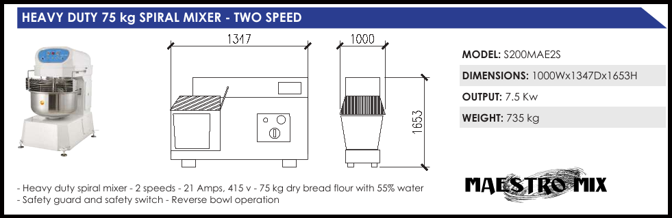 Select from a range of specialist dough mixing spiral mixers. In a spiral mixer, a spiral-shaped agitator remains stationary while the bowl rotates. This method enables spiral mixers to mix the same size dough batch much quicker and with less under-mixed dough than a similarly powered planetary mixer. Spiral mixers can mix dough with less agitator friction than planetary mixers. This allows the dough to be mixed without increasing its temperature, ensuring the dough can rise properly. The S200MAE2S can mix up to 75 kg dough mixed with 55% water. The two speed gear design makes this unit a powerful and heavy duty asset in your kitchen that is guaranteed to bring down dough preparation times. The Maestro Mix range of spiral mixers are the ideal choice for pizzerias, dumpling restaurants, indian and middle eastern restaurants, bakeries and cafes that bake their own bread. 3 years warranty