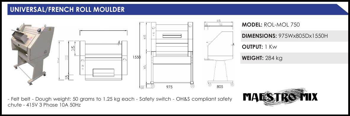 The Maestro Mix ROL-MOL75 Universal Moulder brings unprecented flexibility and versatility to any bakery. Less manual handling of the dough means you can save on labour costs. The Universal Moulder can process dough ranging from 50 grams up to 1.25 kg – Making it ideal for small rolls to large french baguettes. Easy to use controls allow precision fine tuning to achieve perfect results everytime. The unique natural felt is easy to replace, non-stick, non-marking and allows for gentler handling of the dough. Safety features include an emergency stop button and a safety switch. The unit comes on castors for easy mobility.