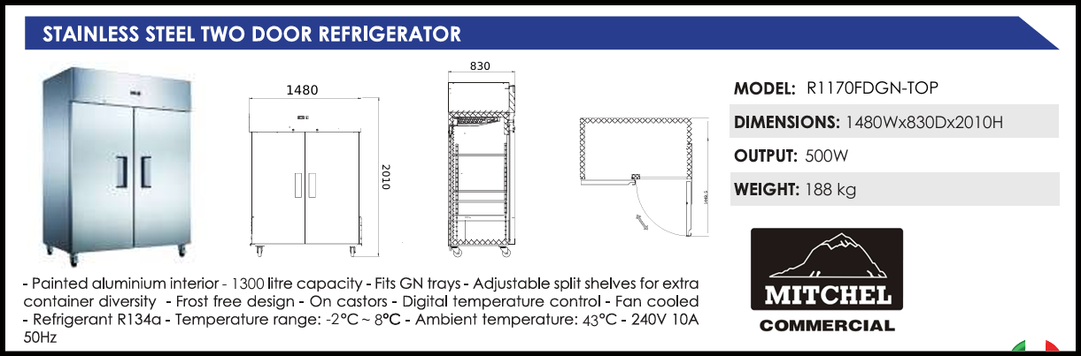 High-capacity 1300L commercial fridge featuring a painted aluminium interior, adjustable split shelves, GN tray compatibility, frost-free design, digital temperature control, and fan-cooled performance.