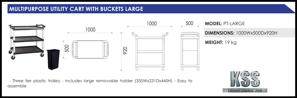 – Three tier plastic trolley – Includes large removable holder (335Wx231Dx445H) – Easy to
