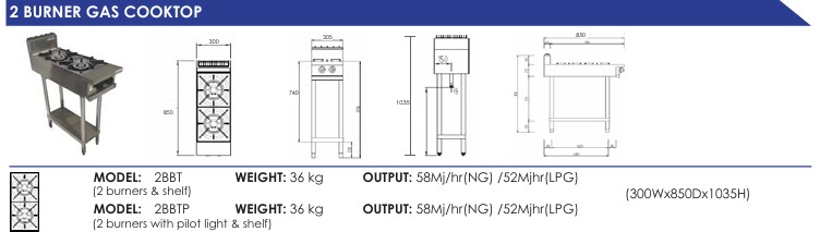 The 2BBT 2 burner Cooktop offers great versatility as a standalone cooktop or a supplementary cooktop for a kitchen where primary cooking is done on a different cooktop such as a wok burner. Easy controls and a sturdy design make this unit a workhorse in the kitchen. The simple design also means that cleaning this unit is a breeze!