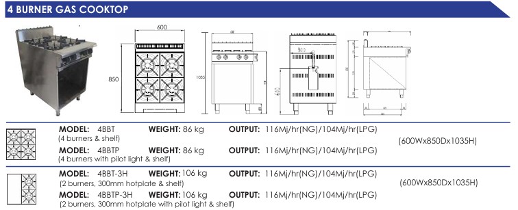 The 4BBT 4 burner Cooktop offers great versatility as a standalone cooktop in a small to mid-sized kitchen. Easy controls and a sturdy design make this unit a workhorse in the kitchen. The simple design also means that cleaning this unit is a breeze!