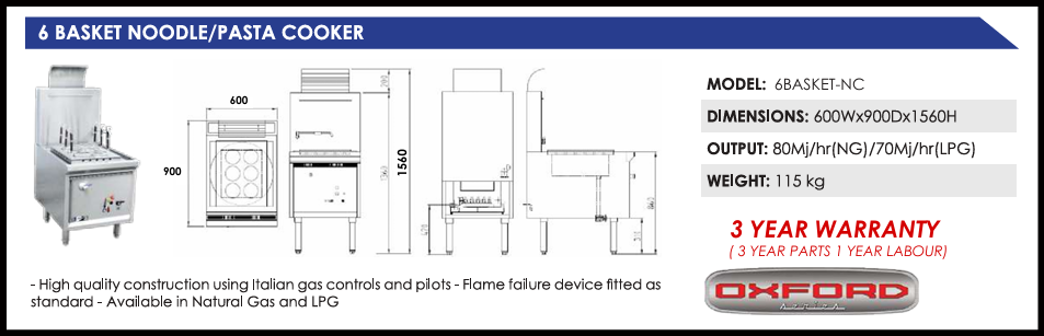 - A modular design means that the 6 Basket Cooker can be lined up with a Oxford Waterless Wok or an Oxford Series Gas Cooktop for a uniform look