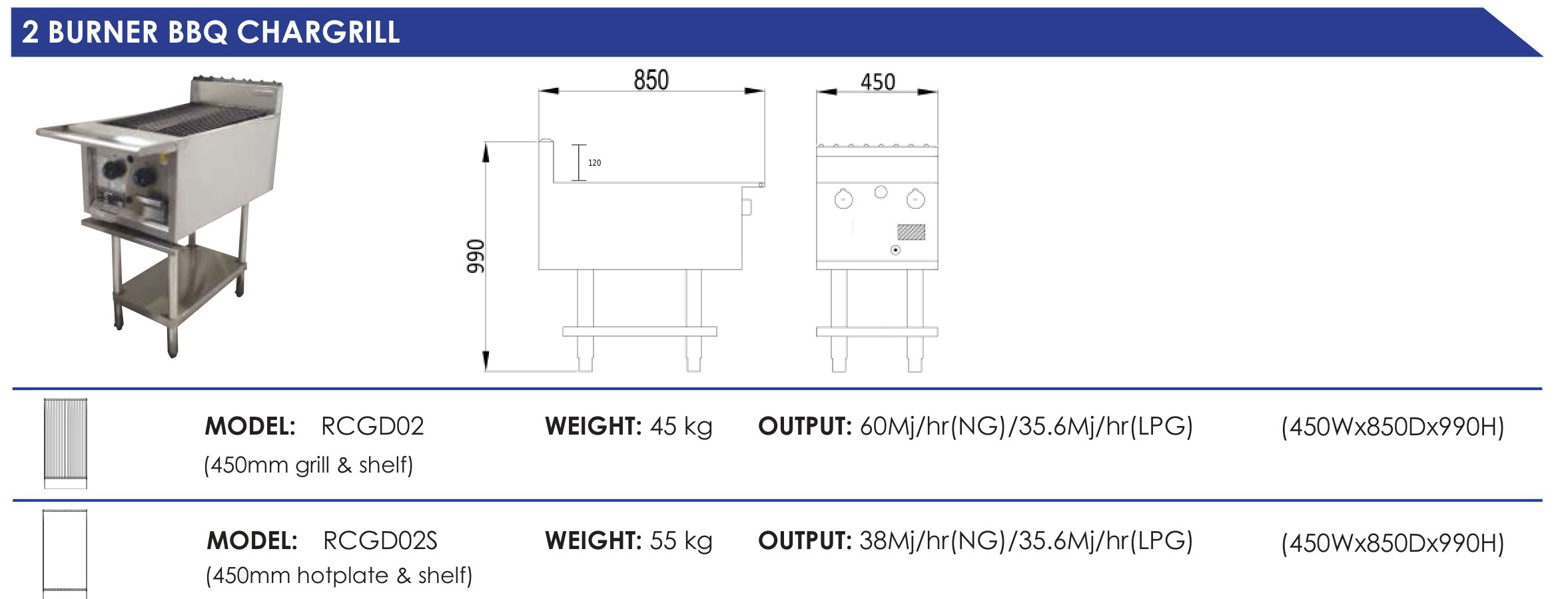 Used by leading restaurant chains in Australia, the Oxford RCG Series Chargrills with hot plates are perfect for any kitchen that cooks chicken, sausages, lamb, steaks and seafood. The unique grill design ensures a perfect sear and cooking result every time. Combining high power and efficiency, the Oxford Series range maximises productivity while ensuring precise cooking. 2 burner BBQ grill with integrated hot plate, removable basting rail included – shelf underneath for added support and stability – basting bar spaced at 85 mm to suit GN 1/9 pans. Available in natural gas or LPG.