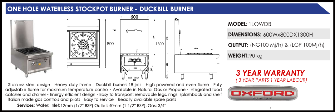 - With a 70 Mj/Hr Duckbill burner, the wok also features the award winning Waterless Cooling Technology