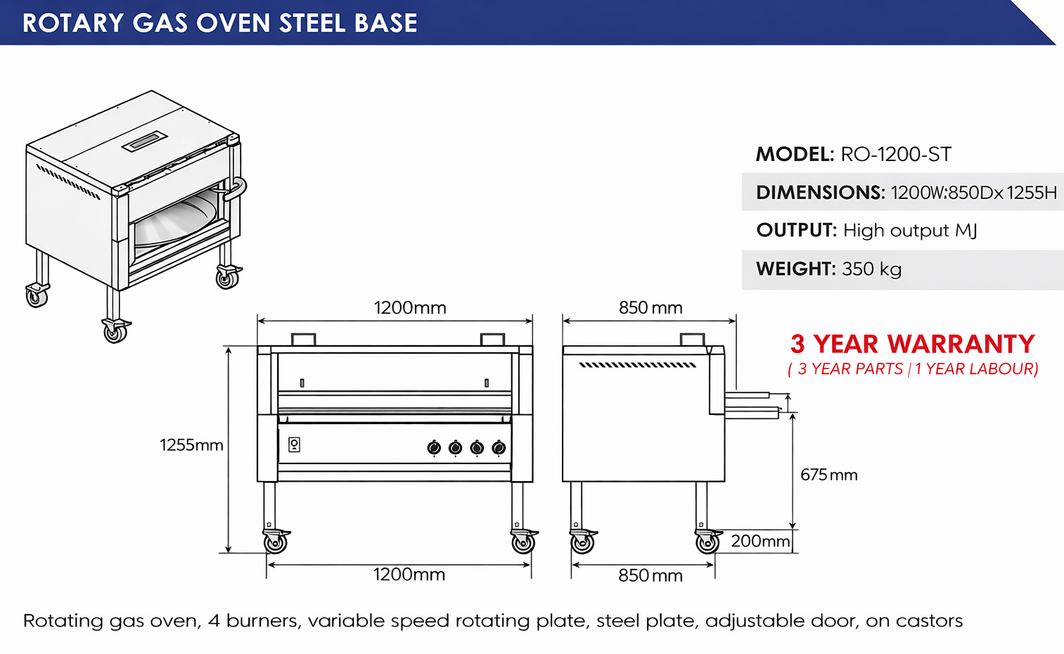 Rotating gas oven, 4 burners, variable speed rotating plate, steel plate, adjustable door, on castors