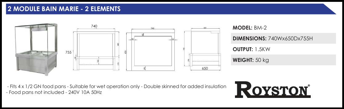 - All Royston Bain Maries fit standard GN 1/2 pans and are double skinned for added insulation