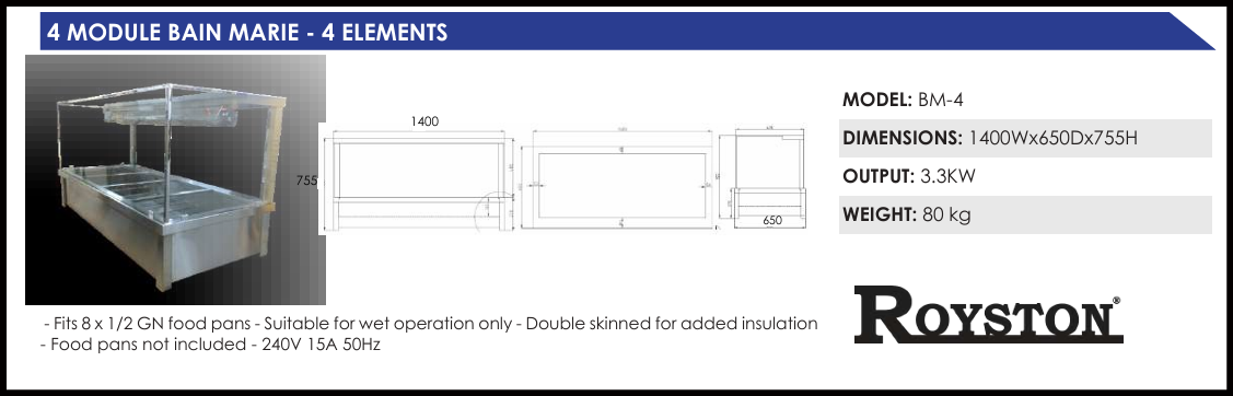 - All Royston Bain Maries fit standard GN 1/2 pans and are double skinned for added insulation