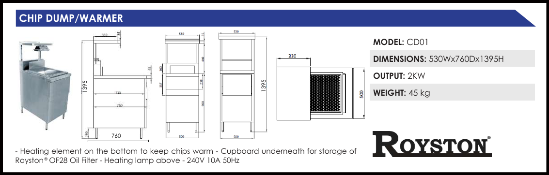 Keep your chips and other fried foods warm, fresh and tasty for longer with the help of the Royston Chip Dump. The unit is designed to be a holding area for chips and fried items post-frying and pre-bagging. Maintain the crispiness of your food thanks to the powerful heat lamp on top and heated element on the bottom. The unit also features a storage cupboard that can be used to store the Royston OF28 oil filter. When placed alongside a fryer, you can have a dedicated frying suite/area in your kitchen without having to impede workflow. The sturdy construction and readily available spare parts make this unit heavy duty and easy to maintain.