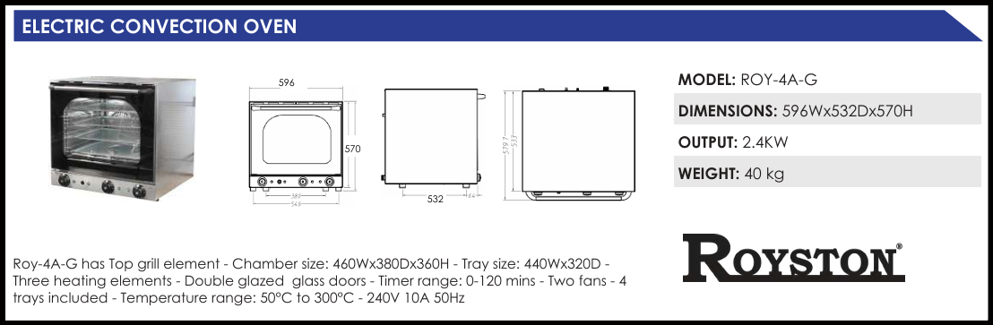 Roy-4A-G has Top grill element – Chamber size: 460Wx380Dx360H – Tray size: 440Wx320D –
