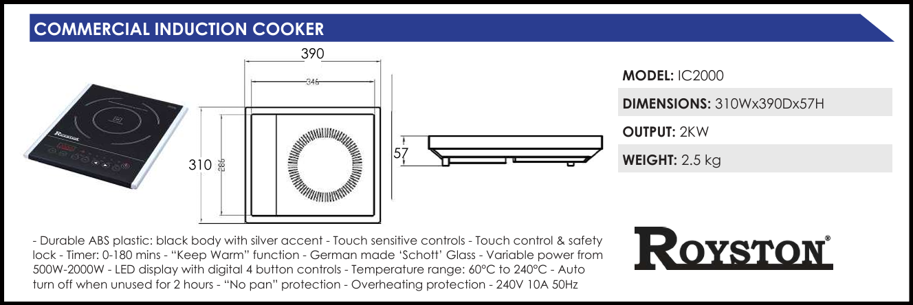 Quickly and easily cook a variety of your signature dishes without the use of burners using the Royston induction range! This induction range features variable power from 500-2000 watts of heating power in a compact a countertop unit for easy use. The integrated touch controls make the unit simple to operate, and the LED display makes it easy to use.