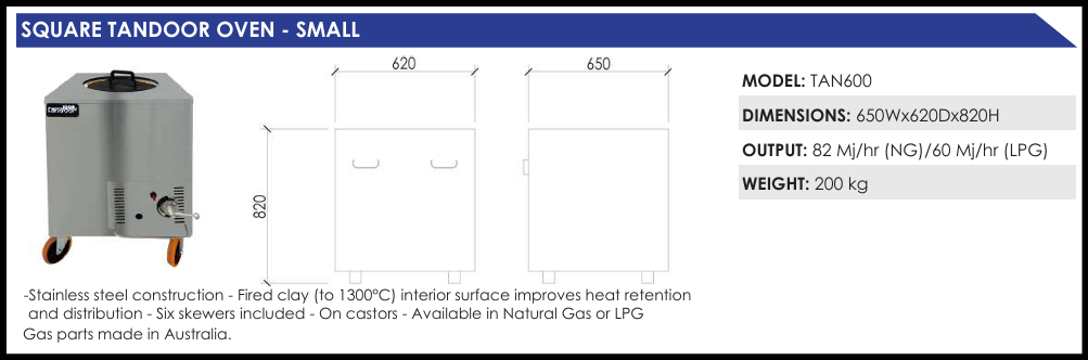 -Stainless steel construction – Fired clay (to 1300?C) interior surface improves heat retention and distribution – Six skewers included – On castors – Available in Natural Gas or LPG Gas parts made in Australia.