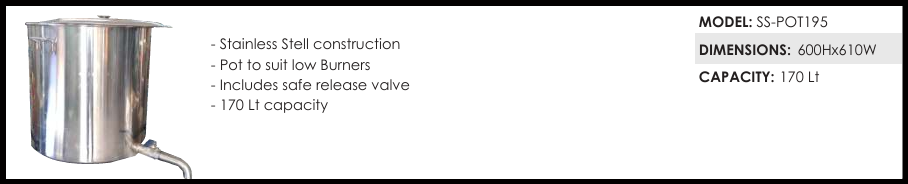 Stainless Stell construction – Pot to suit low Burners – Includes safe release valve – 170 Lt capacity