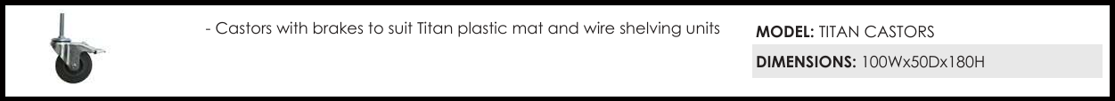 – Castors with brakes to suit Titan plastic mat and wire shelving units