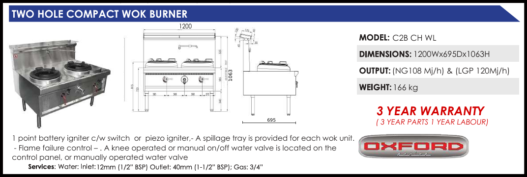 1 point battery igniter c/w switch or piezo igniter,- A spillage tray is provided for each wok unit. Flame failure control. A knee operated or manual on/off water valve is located on the control panel, or manually operated water valve Services: Water: Inlet: 12mm (1/2″ BSP) Outlet: 40mm (1-1/2″ BSP); Gas: 3/4″